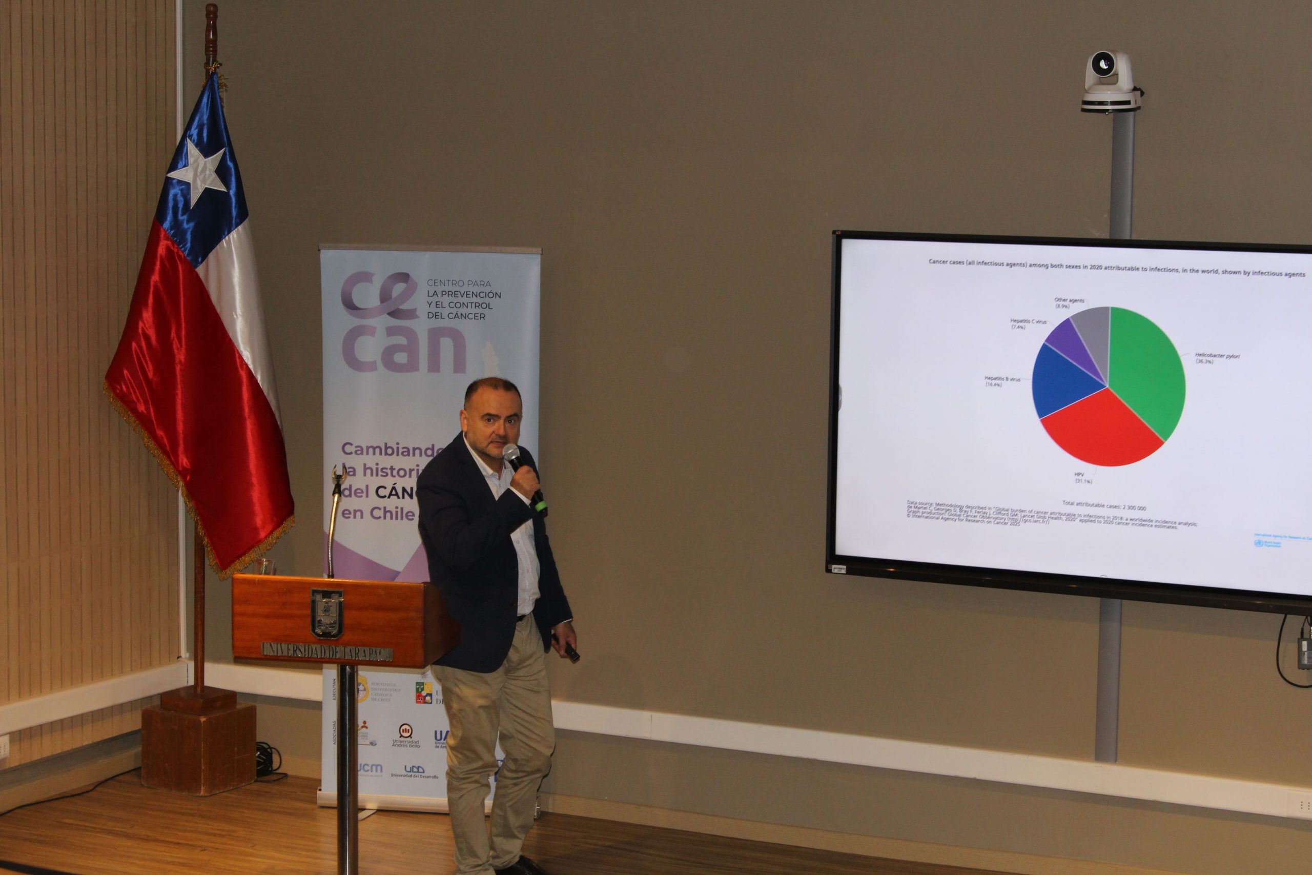 La Dra. Gloria Calaf, investigadora del Instituto de Alta Investigación de la Universidad de Tarapacá, expuso el tema “Agentes cancerígenos en el cáncer de mama”, donde exploró los factores de riesgo asociados a esta enfermedad. El Dr. Francisco Aguayo, de la Facultad de Medicina de la UTA, abordó la temática “Infecciones virales persistentes y cofactores medioambientales en el desarrollo del cáncer”, donde analizó la interacción entre virus y el entorno en la génesis de tumores. Cerró la jornada el Dr. Justo Lorenzo Bermejo, de la Universidad de Heidelberg y el Instituto del Cáncer de Estrasburgo, con la charla “La cohorte EULAT Eradicate GBC en Arica: Oportunidades para la prevención del cáncer”, destacando el estudio y problemáticas del cáncer de vesícula y las posibilidades de prevención basadas en estudios poblacionales.