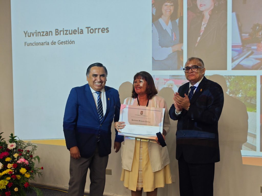 Por su parte, Yuvinzán Brizuela Rojas ingresó a la UTA como secretaria del Departamento de Educación en febrero de 1982, proveniente de la anterior Universidad del Norte. Desde 1984 se desempeñó en el Depto. de Finanzas y en la Vicerrectoría de Administración y Finanzas. Más adelante, en 2011 hasta noviembre de 2025, se desempeñó como secretaria de Rectoría, trabajando bajo la dirección del Dr. Emilio Rodríguez, y también con el Dr. Arturo Flores, a quienes agradeció la confianza depositada en su trabajo, el excelente trato hacia su persona y, sobre todo, el conocimiento que adquirió en tan trascendente e importante cargo.