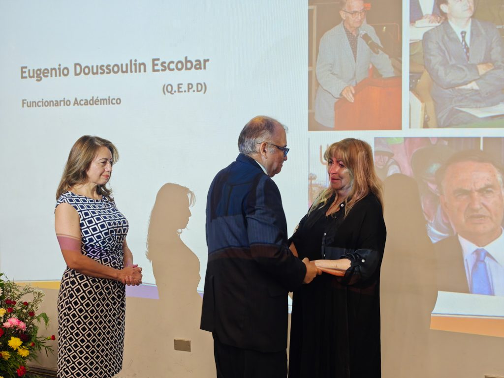 Finalmente, se entregó la distinción a la esposa de Eugenio Doussoulin Escobar (QEPD), ingeniero agrónomo por la U. de Concepción y magíster en Ciencias Agropecuarias de la U. de Chile, desarrolló una amplia trayectoria en como especialista en fisiología de la producción agrícola en ecosistemas árido-desérticos, fue autor de numerosas publicaciones científicas y realizó estadías de perfeccionamiento en diversos países como Egipto, Israel, España, Brasil, México, Inglaterra y Estados Unidos. En 1976 ingresó a la entonces U. del Norte, institución que posteriormente se fusionó con el Instituto Profesional de Arica (antigua sede de la U. de Chile), dando origen a la UTA. Fue Director del Instituto de Agronomía y Decano de la Facultad de Ciencias Agronómicas durante 17 años, y presidente del Consejo de Decanos de Agronomía del CRUCH durante dos periodos. Fue miembro de número, fundador de la Academia Chilena de Ciencias Agronómicas y representante UTA en el directorio de UC Davis Chile. En sus últimos días se desempeñó como director del Depto. de Producción Agrícola y del Centro de Estudios (CEUTA).
