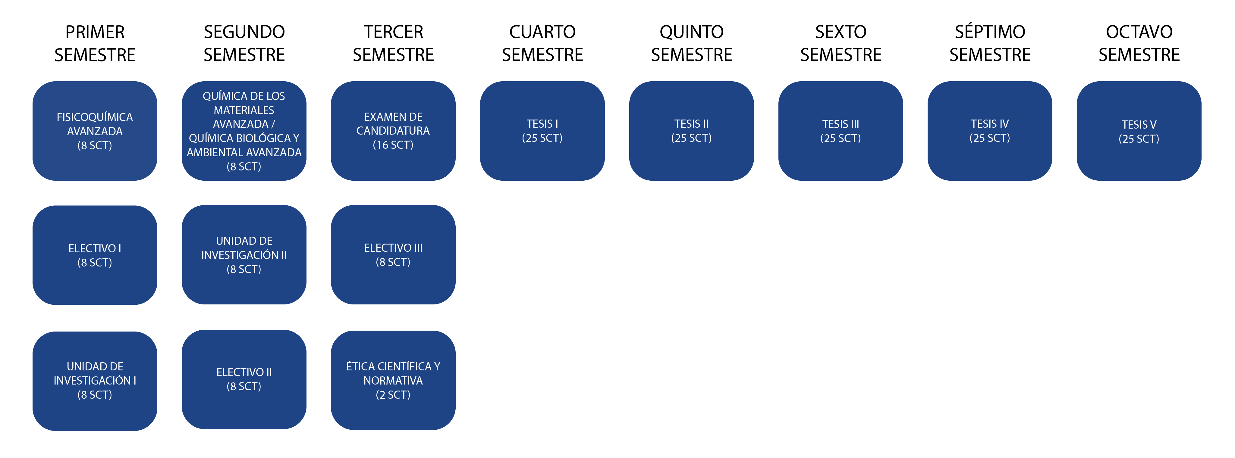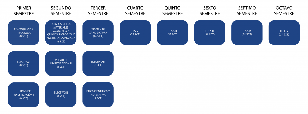 Aprobadas estas asignaturas, se desarrolla la Actividad de Graduación, consistente en el Examen de Candidatura 5 asignaturas correspondientes al desarrollo de la tesis, con un total de 125 SCT.