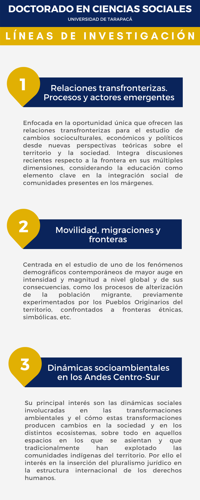 - Propiciar el desarrollo de investigaciones científicas que contribuyan a la comprensión de las realidades sociales y culturales del territorio transfronterizo contribuyendo al posicionamiento de la Universidad de Tarapacá en las líneas de investigación del doctorado.